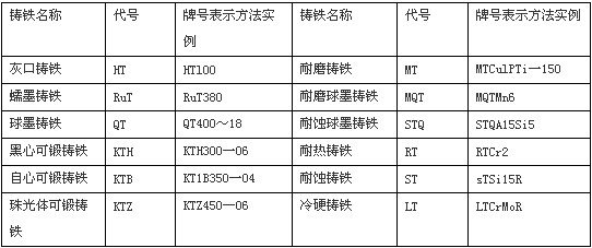 注:本表摘自現(xiàn)行國家標(biāo)準(zhǔn)《鑄鐵牌號表示方法》GB/T5612.