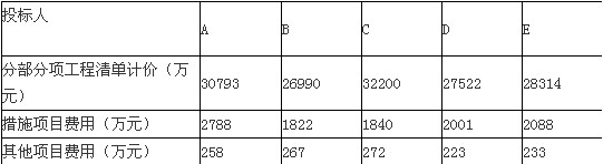 某市一項(xiàng)重點(diǎn)工程,采用工程量清單方式公開(kāi)招標(biāo)。招標(biāo)文件中附有該項(xiàng)目土建工程工程量清單,要求投標(biāo)人根據(jù)本企業(yè)能力確定直接工程費(fèi)、措施費(fèi)、管理費(fèi)率、利潤(rùn)率、(規(guī)費(fèi)費(fèi)率為5%,稅率為3.41%為統(tǒng)一規(guī)定要求)。經(jīng)資格審查后確定的合格投標(biāo)人的名單包括A、B、C、D、E等5家資信和能力符合要求的施工企業(yè)。各投標(biāo)人按技術(shù)標(biāo)、商務(wù)標(biāo)分別裝訂報(bào)送投標(biāo)文件。