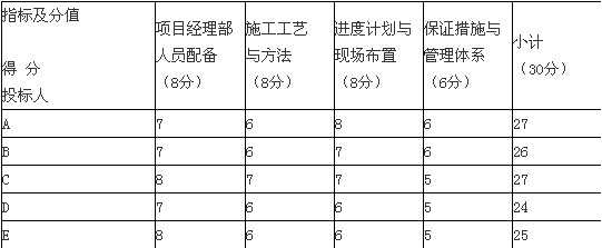 (1)技術(shù)標(biāo)為30分,其中:項(xiàng)目經(jīng)理部人員配備8分、施工工藝與方法8分、進(jìn)度計(jì)劃與現(xiàn)場(chǎng)布置8分、保證措施與管理體系6分。各投標(biāo)人技術(shù)標(biāo)得分見(jiàn)表3-1.
