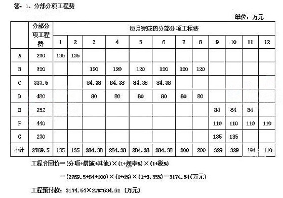 1、計(jì)算各分項(xiàng)工程的分部分項(xiàng)工程費(fèi)、每月完成的分部分項(xiàng)工程費(fèi),把計(jì)算結(jié)果填入紙表5.1中,并列式計(jì)算工程預(yù)付款。