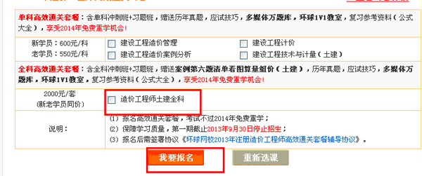 2、選擇要升級的科目,比如:造價工程師土建全科-我要報名