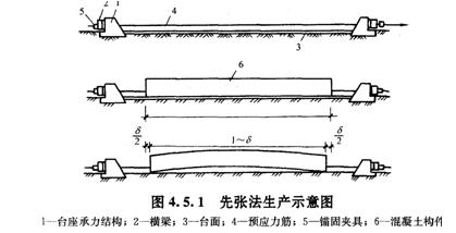先張法是在澆筑混凝土構(gòu)件前張拉預(yù)應(yīng)力鋼筋,并將張拉的預(yù)應(yīng)力鋼筋臨時(shí)固定在臺座或鋼模上,然后再澆筑混凝土,待混凝土達(dá)到一定強(qiáng)度(一般不低于設(shè)計(jì)強(qiáng)度等級的75%),保證預(yù)應(yīng)力筋與混凝土有足夠的粘結(jié)力時(shí),放松預(yù)應(yīng)力筋,借助于混凝土與預(yù)應(yīng)力筋的粘結(jié),使混凝土產(chǎn)生預(yù)壓應(yīng)力,見圖4.5.1.先張法多用于預(yù)制構(gòu)件廠生產(chǎn)定型的中小型構(gòu)件,也常用于生產(chǎn)預(yù)應(yīng)力橋跨結(jié)構(gòu)等。