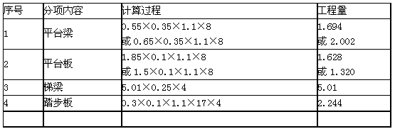 說明:兩種方法計(jì)算出來的平臺(tái)梁/板的混凝土量總和應(yīng)一致,為:3.322m3