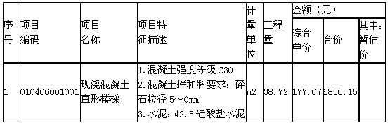 3.按照《建設(shè)工程工程量清單計(jì)價(jià)規(guī)范》(GB50500-2008)的規(guī)定,在答題紙上表6.Ⅰ.3“分部分項(xiàng)工程量清單與計(jì)價(jià)表”中,編制現(xiàn)澆混凝土直形樓梯工程量清單及計(jì)價(jià)表。(注:除現(xiàn)澆混凝土工程量和工程量清單綜合單價(jià)分析表中數(shù)量欄保留三位小數(shù)外,其余保留兩位小數(shù))