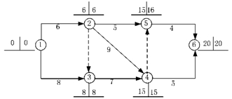【試題解析】采用標號法確定關鍵線路:①→②→④→⑥和①→③→④→⑥,所以選項AB是正確選項;工作2-5的EF=11,工作5-6的ES=15,工作2-5的自由時差為4;工作3-4是關鍵線路上的工作,所以是關鍵工作;工作5-6的ES=15,計劃工期為20,工作5-6的LF=20,工作5-6的LS=16,所以工作5-6的總時差為1。