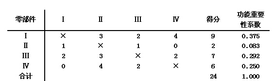 采用0-4評(píng)分法計(jì)算任何零部件的功能重要性系數(shù)都是這種方法。