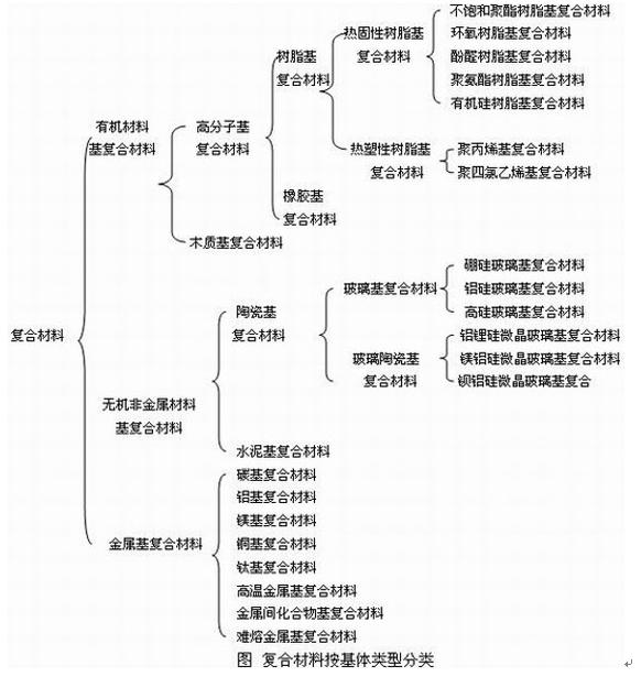 按基體材料類型可分為:有機(jī)材料基、無機(jī)非金屬材料基和金屬基復(fù)合材料三大類,如下圖所示。