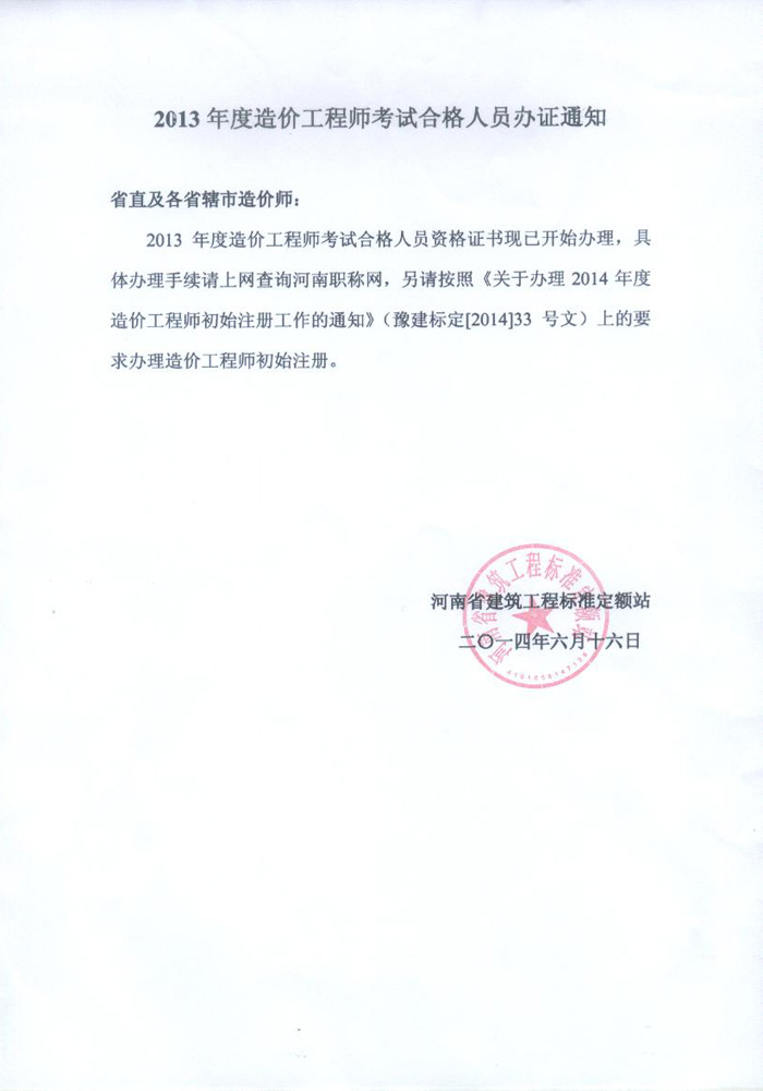 摘要 濟源建設工程造價網(wǎng):2013年造價工程師考試合格人員辦證通知