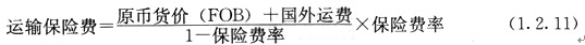 (3)運(yùn)輸保險(xiǎn)費(fèi)。對(duì)外貿(mào)易貨物運(yùn)輸保險(xiǎn)是由保險(xiǎn)人(保險(xiǎn)公司)與被保險(xiǎn)人(出口人或進(jìn)口人)訂立保險(xiǎn)契約,在被保險(xiǎn)人交付議定的保險(xiǎn)費(fèi)后,保險(xiǎn)人根據(jù)保險(xiǎn)契約的規(guī)定對(duì)貨物在運(yùn)輸過(guò)程中發(fā)生的承保責(zé)任范圍內(nèi)的損失給予經(jīng)濟(jì)上的補(bǔ)償。這是一種財(cái)產(chǎn)保險(xiǎn)。計(jì)算公式為: