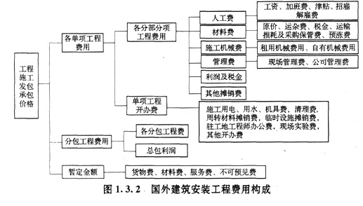 國外的建筑安裝工程費(fèi)用一般是在建筑市場上通過招投標(biāo)方式確定的。工程費(fèi)的高低受建筑產(chǎn)品供求關(guān)系影響較大。國外建筑安裝工程費(fèi)用的構(gòu)成可用圖1.3.2表示。