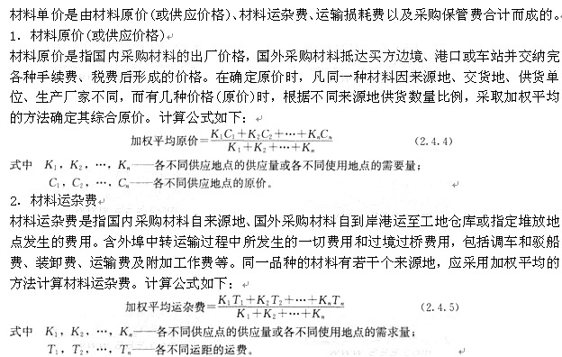 材料單價是指材料(包括構件、成品及半成品等)從其來源地(或交貨地點、供應者倉庫提貨地點)到達施工工地倉庫(施工地點內存放材料的地點)后出庫的綜合平均價格。材料單價一般由材料原價(或供應價格)、材料運雜費、運輸損耗費、采購及保管費組成。此外在計價時,材料費中還應包括單獨列項計算的檢驗試驗費。