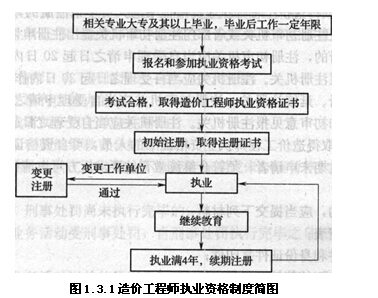 《注冊(cè)造價(jià)工程師管理辦法》(建設(shè)部令第150號(hào))及《造價(jià)工程師繼續(xù)教育實(shí)施辦法》、《造價(jià)工程師職業(yè)道德行為準(zhǔn)則》等文件的陸續(xù)頒布與實(shí)施,確立了我國(guó)造價(jià)工程師執(zhí)業(yè)資格制度體系框架。我國(guó)造價(jià)工程師執(zhí)業(yè)資格制度如圖1.3.1所示。