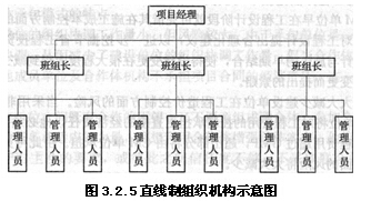 直線制是一種最簡(jiǎn)單的組織機(jī)構(gòu)形式。在這種組織機(jī)構(gòu)中,各種職位均按直線垂直排列,項(xiàng)目經(jīng)理直接進(jìn)行單線垂直領(lǐng)導(dǎo)。直線制組織機(jī)構(gòu)如圖3.2.5所示。