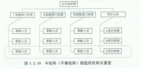 中矩陣制也稱平衡矩陣。在平衡矩陣制組織機(jī)構(gòu)中,項(xiàng)目經(jīng)理被授予一定的權(quán)力,對(duì)項(xiàng)目整體及項(xiàng)目目標(biāo)負(fù)責(zé)。項(xiàng)目組成員是從各職能部門借調(diào)來的成員,并在成員中指定一人擔(dān)任專案主持人。一旦專案結(jié)束,專案主持人的頭銜隨之消失。平衡矩陣制組織形式如圖3.2.10所示,其特點(diǎn)是需要精心建立管理程序和配備訓(xùn)練有素的協(xié)調(diào)人員。平衡矩陣制組織形式適用于中等技術(shù)復(fù)雜程度且建設(shè)周期較長(zhǎng)的工程項(xiàng)目。