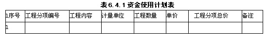 各工程分項(xiàng)的詳細(xì)資金使用計(jì)劃表應(yīng)包括:工程分項(xiàng)編號(hào)、工程內(nèi)容、計(jì)量單位、工程數(shù)量、單價(jià)、工程分項(xiàng)總價(jià)等內(nèi)容(見(jiàn)表6.4.1)。