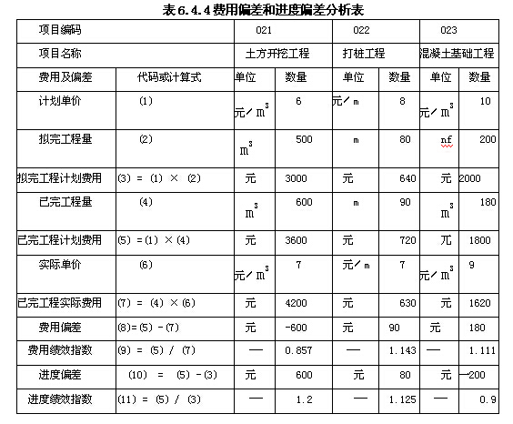 當(dāng)SV>0時(shí),說(shuō)明工程進(jìn)度超前;當(dāng)SV 【例6.4.51某工程施工至2012年9月底,經(jīng)統(tǒng)計(jì)分析得:已完工程計(jì)劃費(fèi)用為1500萬(wàn)元,已完工程實(shí)際費(fèi)用為1800萬(wàn)元,擬完工程計(jì)劃費(fèi)用為1600萬(wàn)元,則該工程此時(shí)的費(fèi)用偏差和進(jìn)度偏差各為多少? 解:(1)費(fèi)用偏差=1500-1800=-300(萬(wàn)元) 說(shuō)明工程費(fèi)用超支300萬(wàn)元。 (2)進(jìn)度偏差=1500-1600=-100(萬(wàn)元) 說(shuō)明工程進(jìn)度拖后100萬(wàn)元。 2.偏差參數(shù) (1)局部偏差與累計(jì)偏差。局部偏差有兩層含義:一是對(duì)于整個(gè)工程項(xiàng)目而言,指各單項(xiàng)工程、單位工程和分部分項(xiàng)工程的偏差;二是相對(duì)于工程項(xiàng)目實(shí)施的時(shí)間而言,指每一控制周期所發(fā)生的偏差。累計(jì)偏差是指在工程項(xiàng)目已經(jīng)實(shí)施的時(shí)間內(nèi)累計(jì)發(fā)生的偏差。累計(jì)偏差是一個(gè)動(dòng)態(tài)的概念,其數(shù)值總是與具體時(shí)間聯(lián)系在一起,第一個(gè)累計(jì)偏差在數(shù)值上等于局部偏差,最終的累計(jì)偏差就是整個(gè)工程項(xiàng)目的偏差。 在進(jìn)行費(fèi)用偏差分析時(shí),對(duì)局部偏差和累計(jì)偏差都要進(jìn)行分析。在每一控制周期內(nèi),發(fā)生局部偏差的工程內(nèi)容及原因一般都比較明確,分析結(jié)果比較可靠,而累計(jì)偏差所涉及的工程內(nèi)容較多、范圍較大,且原因也較復(fù)雜。因此,累計(jì)偏差的分析必須以局部偏差分析為基礎(chǔ)。但是,累計(jì)偏差分析并不是對(duì)局部偏差分析的簡(jiǎn)單匯總,需要對(duì)局部偏差的分析結(jié)果進(jìn)行綜合分析,其結(jié)果更能顯示代表性和規(guī)律性,對(duì)費(fèi)用控制工作在較大范圍內(nèi)具有指導(dǎo)作用。 (2)絕對(duì)偏差與相對(duì)偏差。絕對(duì)偏差是指實(shí)際值與計(jì)劃值比較所得到的差額。相對(duì)偏差則是指偏差的相對(duì)數(shù)或比例數(shù),通常是用絕對(duì)偏差與費(fèi)用計(jì)劃值的比值來(lái)表示: 費(fèi)用相對(duì)偏差= =(6.4.35) 與絕對(duì)偏差一樣,相對(duì)偏差可正可負(fù),且兩者符號(hào)相同。正值表示費(fèi)用節(jié)約,負(fù)值表示費(fèi)用超支。兩者都只涉及費(fèi)用的計(jì)劃值和實(shí)際值,既不受工程項(xiàng)目層次的限制,也不受工程項(xiàng)目實(shí)施時(shí)間的限制,因而在各種費(fèi)用比較中均可采用。 (3)偏差績(jī)效指數(shù)。 1)費(fèi)用績(jī)效指數(shù)(Cost Performance Index,CPI)。 費(fèi)用績(jī)效指數(shù)(CPI)= (6.4.36) 2)進(jìn)度績(jī)效指數(shù)(Schedule Performance Index,SPI)。 進(jìn)度績(jī)效指數(shù)=(6.4.37) 這里的績(jī)效指數(shù)是相對(duì)值,既可用于工程項(xiàng)目?jī)?nèi)部的偏差分析,也可用于不同工程項(xiàng)目之間的偏差比較。而前述的偏差(費(fèi)用偏差和進(jìn)度偏差)主要適用于工程項(xiàng)目?jī)?nèi)部的偏差分析。 (二)常用的偏差分析方法 常用的偏差分析方法有橫道圖法、時(shí)標(biāo)網(wǎng)絡(luò)圖法、表格法和曲線法。 1.橫道圖法 應(yīng)用橫道圖法進(jìn)行費(fèi)用偏差分析,是用不同的橫道線標(biāo)識(shí)已完工程計(jì)劃費(fèi)用、擬完工程計(jì)劃費(fèi)用和已完工程實(shí)際費(fèi)用,橫道線的長(zhǎng)度與其數(shù)值成正比。然后,再根據(jù)上述數(shù)據(jù)分析費(fèi)用偏差和進(jìn)度偏差。 橫道圖法具有簡(jiǎn)單直觀的優(yōu)點(diǎn),便于掌握工程費(fèi)用的全貌。但這種方法反映的信息量少,因而其應(yīng)用具有一定的局限性。 2.時(shí)標(biāo)網(wǎng)絡(luò)圖法 應(yīng)用時(shí)標(biāo)網(wǎng)絡(luò)圖法進(jìn)行費(fèi)用偏差分析,是根據(jù)時(shí)標(biāo)網(wǎng)絡(luò)圖得到每一時(shí)間段擬完工程計(jì)赳費(fèi)用,然后根據(jù)實(shí)際工作完成情況測(cè)得已完工程實(shí)際費(fèi)用,并通過(guò)分析時(shí)標(biāo)網(wǎng)絡(luò)圖中的實(shí)際進(jìn)度前鋒線,得出每一時(shí)間段已完工程計(jì)劃費(fèi)用,這樣,即可分析費(fèi)用偏差和進(jìn)度偏差。 實(shí)際進(jìn)度前鋒線表示整個(gè)工程項(xiàng)目目前實(shí)際完成的工作面情況,將某一確定時(shí)點(diǎn)下時(shí)標(biāo)網(wǎng)絡(luò)圖中各項(xiàng)工作的實(shí)際進(jìn)度點(diǎn)相連就可得到實(shí)際進(jìn)度前鋒線。 時(shí)標(biāo)網(wǎng)絡(luò)圖法具有簡(jiǎn)單、直觀的優(yōu)點(diǎn),可用來(lái)反映累計(jì)偏差和局部偏差,但實(shí)際進(jìn)度前鋒線的繪制需要有工程網(wǎng)絡(luò)計(jì)劃為基礎(chǔ)。 3.表格法 表格法是一種進(jìn)行偏差分析的最常用方法。應(yīng)用表格法分析偏差,是將項(xiàng)目編號(hào)、名稱(chēng)、各個(gè)費(fèi)用參數(shù)及費(fèi)用偏差值等綜合納入一張表格中,可在表格中直接進(jìn)行偏差的比較 分析。例如,某基礎(chǔ)工程在一周內(nèi)費(fèi)用偏差和進(jìn)度偏差分析見(jiàn)表6.4.4。 應(yīng)用表格法進(jìn)行偏差分析具有如下優(yōu)點(diǎn):靈活、適用性強(qiáng),可根據(jù)實(shí)際需要設(shè)計(jì)表格;信息量大,可反映偏差分析所需的資料,從而有利于工程造價(jià)管理人員及時(shí)采取針對(duì)措施,加強(qiáng