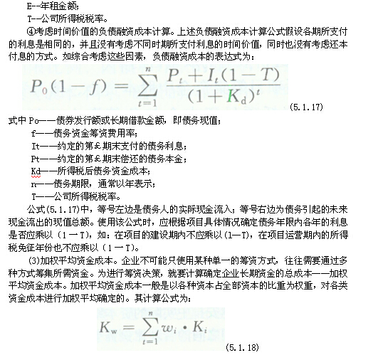 (2)個別資金成本。個別資金成本是指各種資金來源的成本。項目公司從不同渠道、以不同方式取得資本所付出的代價和承擔的風險是不同的,因此,個別資金成本是不同的。企業(yè)的長期資金一般有優(yōu)先股、普通股、留存收益、長期借款、債券、租賃等,其中前三者統(tǒng)稱權益資金,后三者統(tǒng)稱債務資金。根據(jù)資金來源也就相應地分為優(yōu)先股成本、普通股成本、留存收益成本、長期貸款成本、債券成本、租賃成本等,前三者統(tǒng)稱權益資金成本,后三者統(tǒng)稱債務資金成本。