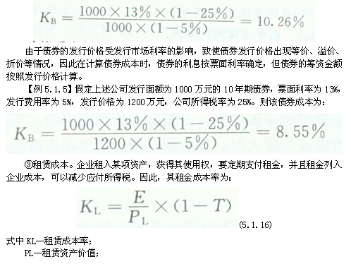【例5.1.4】某公司為新建項目發(fā)行總面額為i000萬元的10年期債券,票面利率為13%,發(fā)行費用為5%,公司所得稅稅率為25%。該債券的成本為:
