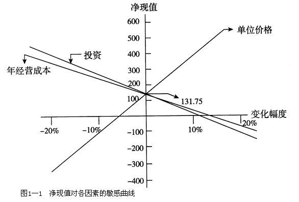 由圖1-1可知財(cái)務(wù)凈現(xiàn)值對(duì)單位產(chǎn)品價(jià)格最敏感,其次是投資和年經(jīng)營(yíng)成本。