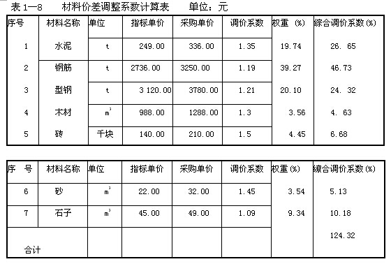解:類似工程造價指標(biāo)中建筑工程費(fèi)用中所含材料費(fèi)、人工費(fèi)、機(jī)械費(fèi)、綜合稅費(fèi)占建筑工程費(fèi)的比例分別為:58.64%,14.5 8%、9.46%、17.32%。在表1-8中計算建筑工程費(fèi)中材料綜合調(diào)價系數(shù),并計算擬建工程的建筑工程費(fèi)。