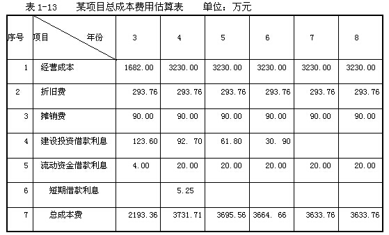 2.根據(jù)總成本費(fèi)用的構(gòu)成列出總成本費(fèi)用估算表的費(fèi)用名稱,見(jiàn)表1 -13。計(jì)算固定資產(chǎn)折舊費(fèi)和無(wú)形資產(chǎn)攤銷費(fèi),并將折舊費(fèi)、攤銷費(fèi)、年經(jīng)營(yíng)成本和借款還本付息表中的第3年貸款利息與該年流動(dòng)資金貸款利息等數(shù)據(jù),并填人總成本費(fèi)用估算表1 -13中,計(jì)算出該年的總成本費(fèi)用。