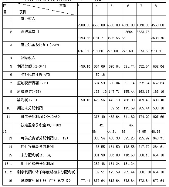 3.將第3年總成本計(jì)人該年的利潤(rùn)與利潤(rùn)分配表中,并計(jì)算該年的其他費(fèi)用:利潤(rùn)總額、應(yīng)納所得稅額、所得稅、凈利潤(rùn)、可供分配利潤(rùn)、法定盈余公積金、可供投資者分配利潤(rùn)、應(yīng)付各投資方股利、還款未分配利潤(rùn)以及下年期初未分配利潤(rùn)等,均按利潤(rùn)與利潤(rùn)分配表中的公式逐一計(jì)算求得,見(jiàn)表1-14。