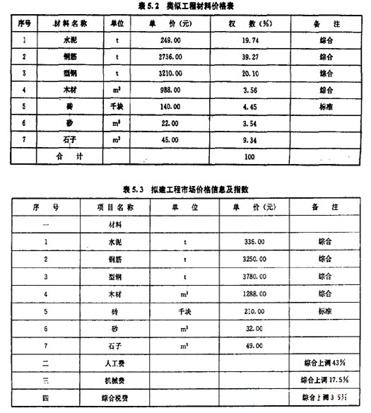 某企業(yè)擬建一條生產(chǎn)線。設(shè)計使用同規(guī)模標準化設(shè)計資料。類似工程的工程費用造價指標見表5.1;類似工程造價指標中主要材料價格表見表5.2.擬建工程當?shù)噩F(xiàn)行市場價格信息價格及指數(shù)見表5.3.