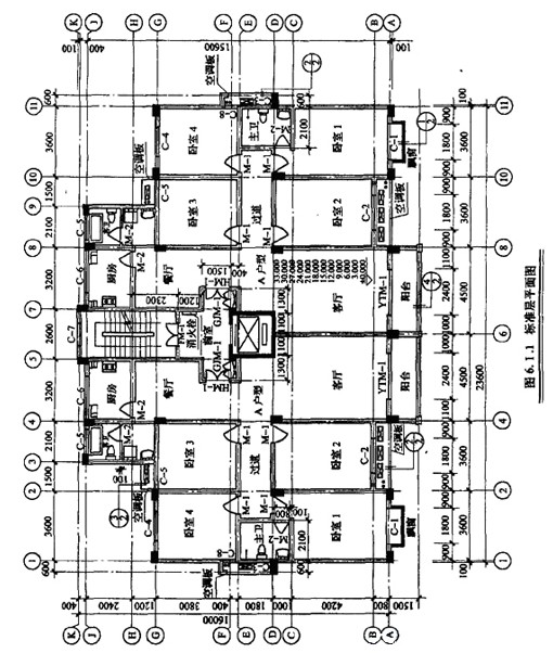 某小高層住宅樓建筑部分設(shè)計(jì)如圖6.I所示,共12層。每層層高均為3米,電梯機(jī)房與樓梯間部分凸出屋面。墻體除注明者外均為200mm厚加氣混凝土墻.軸線位于墻中。外墻采用50mm厚聚苯板保溫。樓面做法為20mm厚水泥砂漿抹面壓光。樓層鋼筋混凝土板厚100mm,內(nèi)墻做法為20mm厚混合砂漿抹面壓光。為簡(jiǎn)化計(jì)算首層建筑面積按標(biāo)準(zhǔn)層建筑面積計(jì)算.陽(yáng)臺(tái)為全封閉陽(yáng)臺(tái),⑤和⑦軸上混凝土柱超過(guò)墻體寬度部分建筑面積忽略不計(jì),門窗洞口尺寸見(jiàn)表6.I.1,工程做法見(jiàn)表6.I.2.