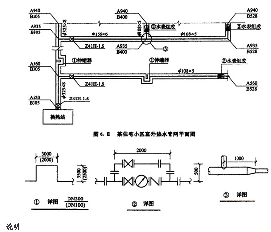 1.本圖所示為某住宅小區(qū)室外熱水管網(wǎng)平面布置圖.該管道系統(tǒng)工作壓力為1.0MPa.熱水溫度為95℃.圖中平面尺寸均以相對(duì)坐標(biāo)標(biāo)注.單位以m計(jì),詳圖尺寸以mm計(jì)。
