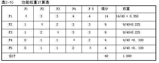 解:根據(jù)背景資料所給出的條件,各功能權(quán)重的計算結(jié)果見表2-10。