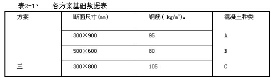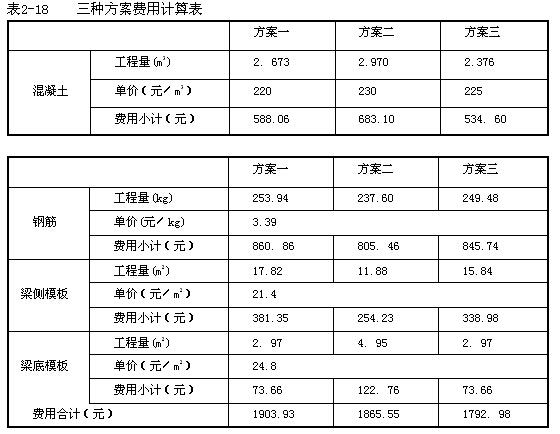 3.假設(shè)該工程的一根9.9m長的現(xiàn)澆鋼筋混凝土梁可采用三種設(shè)計方案,其斷面尺寸均滿足強度要求。該三種方案分別采用A、B、C三種不同的現(xiàn)場制作混凝土,有關(guān)數(shù)據(jù)見表2-170經(jīng)測算,現(xiàn)場制作混凝土所需費用如下:A種混凝土為220元/m3,B種混凝土為230元/m3,C種混凝土為225元/m3 0另外,梁側(cè)模21.4元/m2,梁底模24.8元/m2;鋼筋及制作、綁扎為3390元/t。