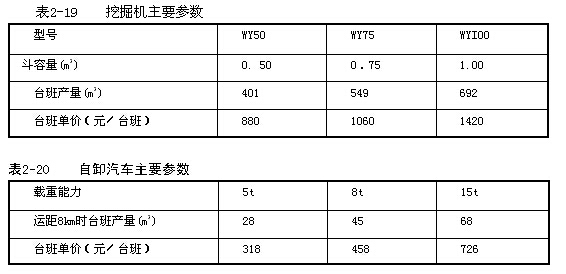 某機械化施工公司承包了某工程的土方施工任務(wù),坑深為-4.Om,土方工程量為9800m3,平均運土距離為8km,合同工期為10天。該公司現(xiàn)有WY50,WY75,WYI00液壓挖掘機各4臺、2臺、1臺及5t,8t,15t自卸汽車各10臺、20臺、10臺,其主要參數(shù)見表2-19和表2-20。