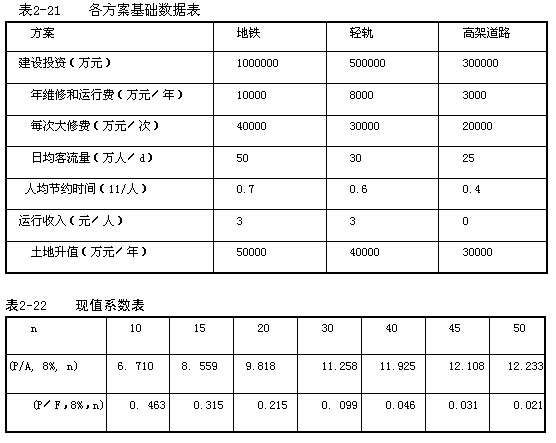 某特大城市為改善目前已嚴(yán)重?fù)矶碌哪吵鞘兄鞲傻赖慕煌顩r,擬投資建設(shè)一交通項(xiàng)目,有地鐵、輕軌和高架道路三個(gè)方案。該三個(gè)方案的使用壽命均按50年計(jì)算,分別需每1 5年、10年、20年大修一次。單位時(shí)間價(jià)值為10元/h,基準(zhǔn)折現(xiàn)率為8%,其他有關(guān)數(shù)據(jù),見(jiàn)表2-21 。不考慮建設(shè)工期的差異,即建設(shè)投資均按期初一次性投資考慮,不考慮動(dòng)拆遷工作和建設(shè)期間對(duì)交通的影響,三個(gè)方案均不計(jì)殘值,每年按360天計(jì)算。壽命周期成本和系統(tǒng)效率計(jì)算結(jié)果取整數(shù),系統(tǒng)費(fèi)用效率計(jì)算結(jié)果保留兩位小數(shù)。
