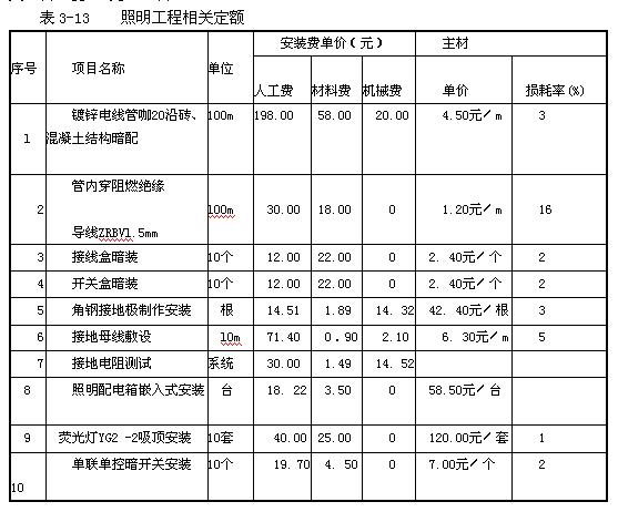 1.某電話機房照明系統(tǒng)中一回路,如圖3-2所示。該照明工程相關(guān)定額規(guī)定,見表3-13。人工日工資50元/工日。