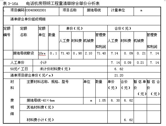 2.根據(jù)上述相關(guān)定額(表3-13)和《計價規(guī)范》的要求,計算接地母線、電氣配管和電氣配線分項工程的工程量清單綜合單價。