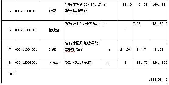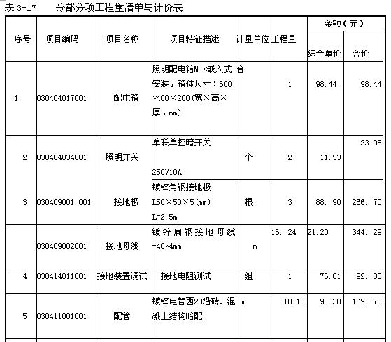 表3-17中,配電箱、照明開關(guān)、接地裝置調(diào)試、接線盒和熒光燈綜合單價根據(jù)表3-13中的數(shù)據(jù)計算,計算式為: