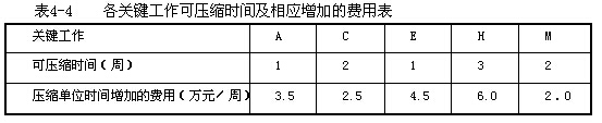 經(jīng)分析,這種技術(shù)措施的三個(gè)比選方案對(duì)施工網(wǎng)絡(luò)計(jì)劃的關(guān)鍵線路均沒(méi)有影響。各關(guān)鍵工作可壓縮的時(shí)間及相應(yīng)增加的費(fèi)用見(jiàn)表4―4。