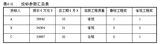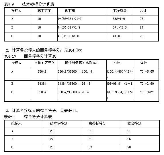 解:1.計(jì)算各投標(biāo)人的技術(shù)標(biāo)得分,見(jiàn)表4-9。