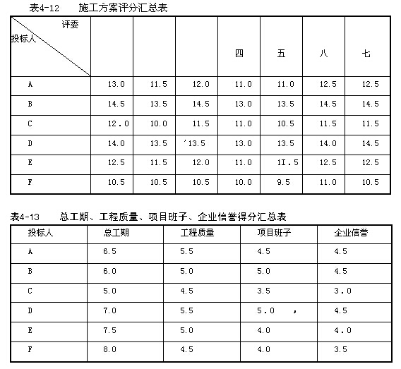 表4-12為各評委對六家投標人施工方案評分的匯總表。