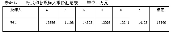 表4-14為標底和各投標人的報價匯總表。