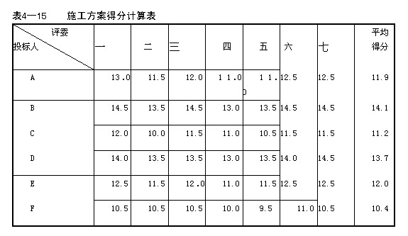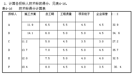 解:1.計算各投標人施工方案的得分,見表4-15。
