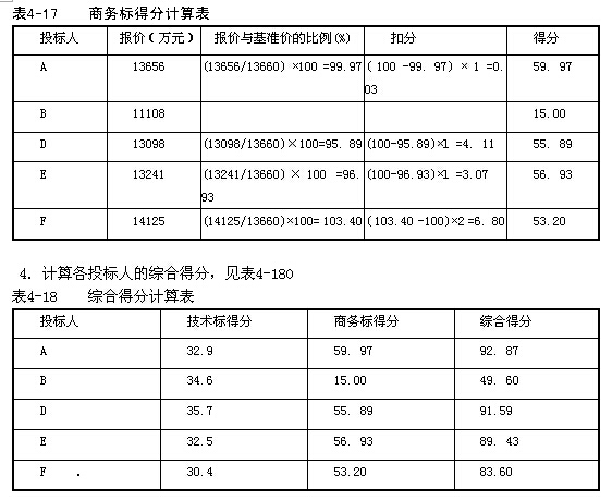 3.計算各投標人的商務(wù)標得分,見表4-17。