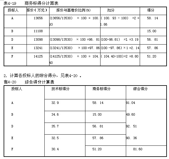 解:1.計算各投標人的商務(wù)標得分,見表4-19。