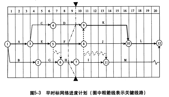 答:該工程早時(shí)標(biāo)網(wǎng)絡(luò)進(jìn)度計(jì)劃及第9周末的實(shí)際進(jìn)度前鋒線如圖5-3所示。