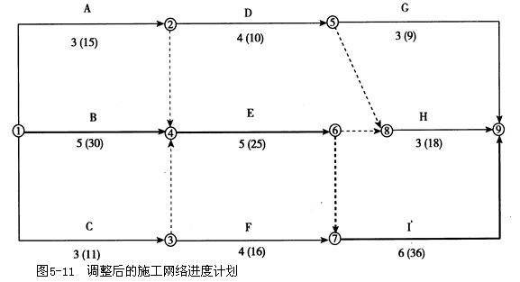 答:根據(jù)施工工藝和組織的要求,對(duì)初始網(wǎng)絡(luò)進(jìn)度計(jì)劃做出調(diào)整后的網(wǎng)絡(luò)進(jìn)度計(jì)劃如圖5-11所示。關(guān)鍵線路為圖中粗線所示。