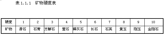 ?、塾捕取S捕仁堑V物抵抗外力刻劃、壓人或研磨等機械作用的能力。鑒定礦物常用一些礦物互相刻劃來測定其相對硬度,一般分為10個標準等級,如表1.1.1礦物硬度表所列。