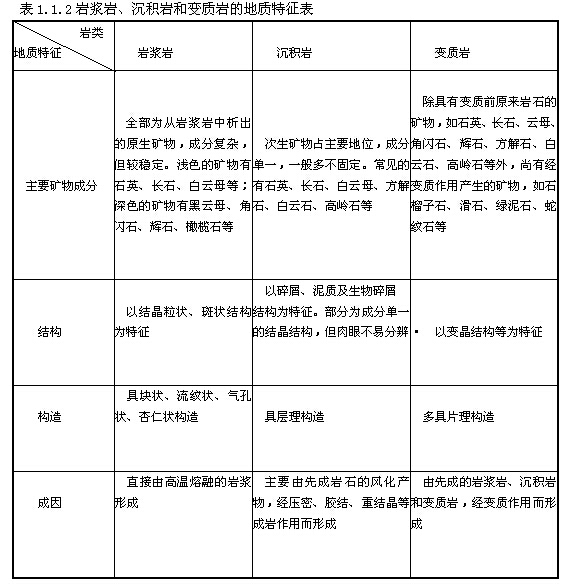 三大類巖石的主要區(qū)別。根據(jù)上述三大類巖石的特征描述,現(xiàn)將它們之間的主要區(qū)別歸納如表1.1.20