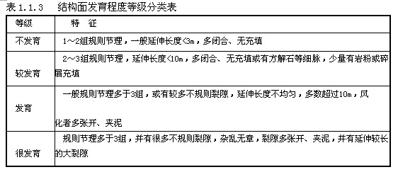 結構面是切割巖體的各種地質(zhì)界面的統(tǒng)稱,是一些具有一定方向,延展較廣較薄的二維地質(zhì)界面,如層面、沉積間斷面、節(jié)理、裂隙、裂縫、斷層等,也包括厚度較薄的軟弱夾層。結構面的特征是影響結構面強度及其他性能的重要因素,一般從方位、間距、延續(xù)性、粗糙度、結構面?zhèn)缺趶姸?、張開度、充填物、滲流、節(jié)理組數(shù)、塊體大小等方面來描述結構面的特征。其中節(jié)理組數(shù)的多少決定了巖石的塊體大小及巖體的結構類型,表1.1.3是根據(jù)節(jié)理組數(shù)劃分的結構面發(fā)育程度來予以分級的。
