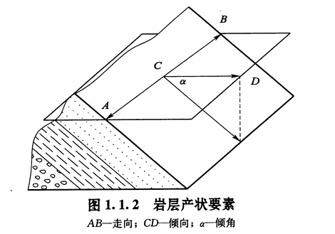 一般將巖層在空間中的位置定義為巖層產(chǎn)狀。傾斜巖層的產(chǎn)狀,是用巖層層面的走 向、傾向和傾角三個產(chǎn)狀要素,如圖1.1.2所示。一般而言,通過巖層產(chǎn)狀的三個要素, 可以表達出經(jīng)過構造后的構造形態(tài)在空間的位置。