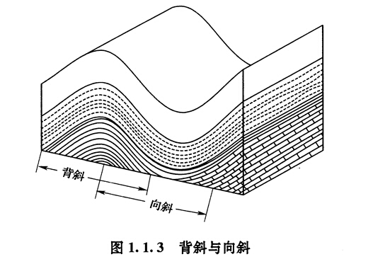褶曲是褶皺構造中的一個彎曲,兩個或兩個以上褶曲構造的組合構成褶皺構造,每一個褶曲都有核部、翼、軸面、軸及樞紐等幾個褶曲要素。褶曲的基本形態(tài)是背斜和向斜,如圖1.1.3所示。背斜褶曲是巖層向上拱起的彎曲,以褶曲軸為中心向兩翼傾斜。當?shù)孛媸艿絼兾g而出露有不同地質(zhì)年代的巖層時,較老的巖層出現(xiàn)在褶曲的軸部,從軸部向兩翼,依次出現(xiàn)的是較新的巖層。向斜褶曲,是巖層向下凹的彎曲,其巖層的傾向與背斜相反,兩翼的巖層都向褶曲的軸部傾斜。當?shù)孛嬖馐軇兾g,在褶曲軸部出露的是較新的巖層,向兩翼依次出露的是較老的巖層。